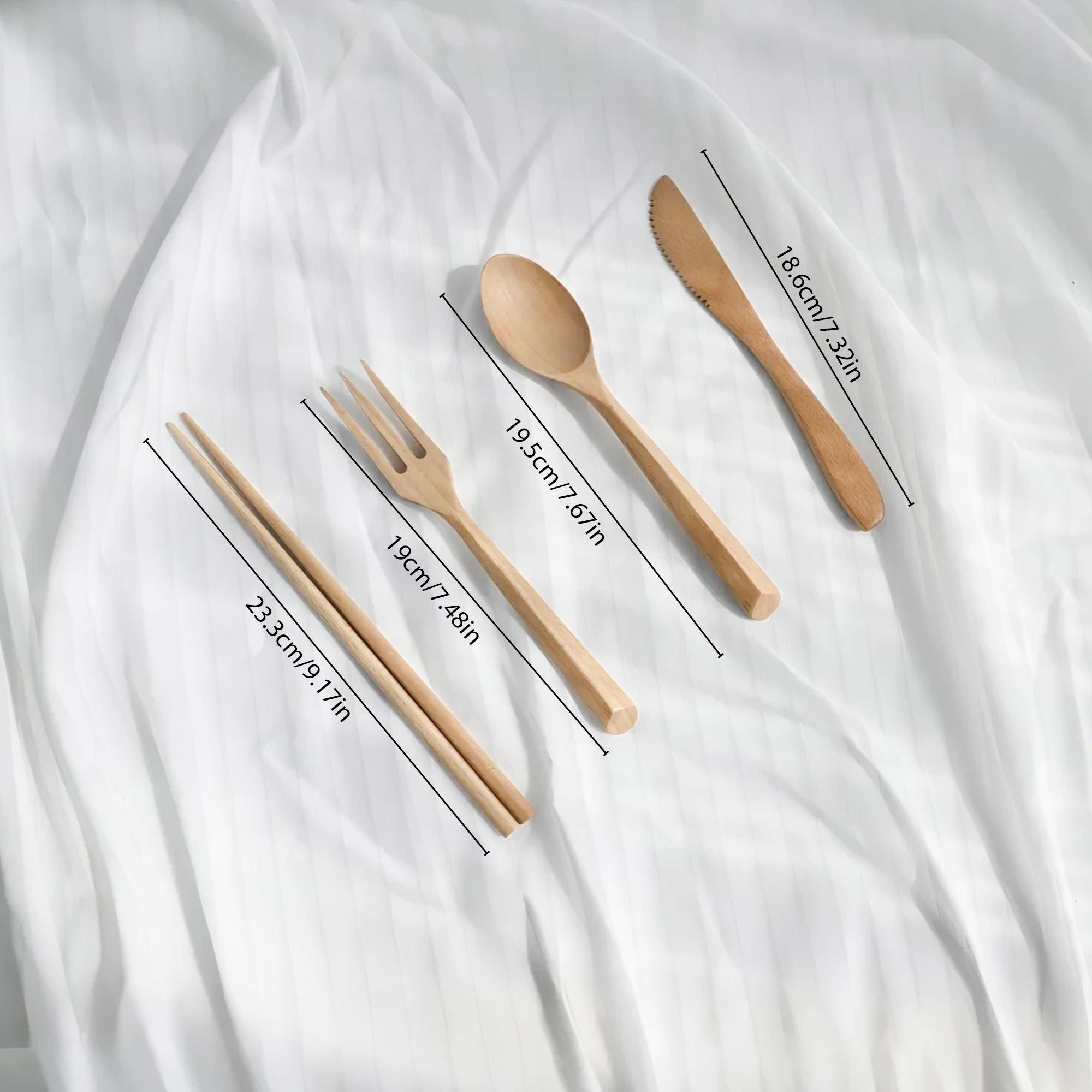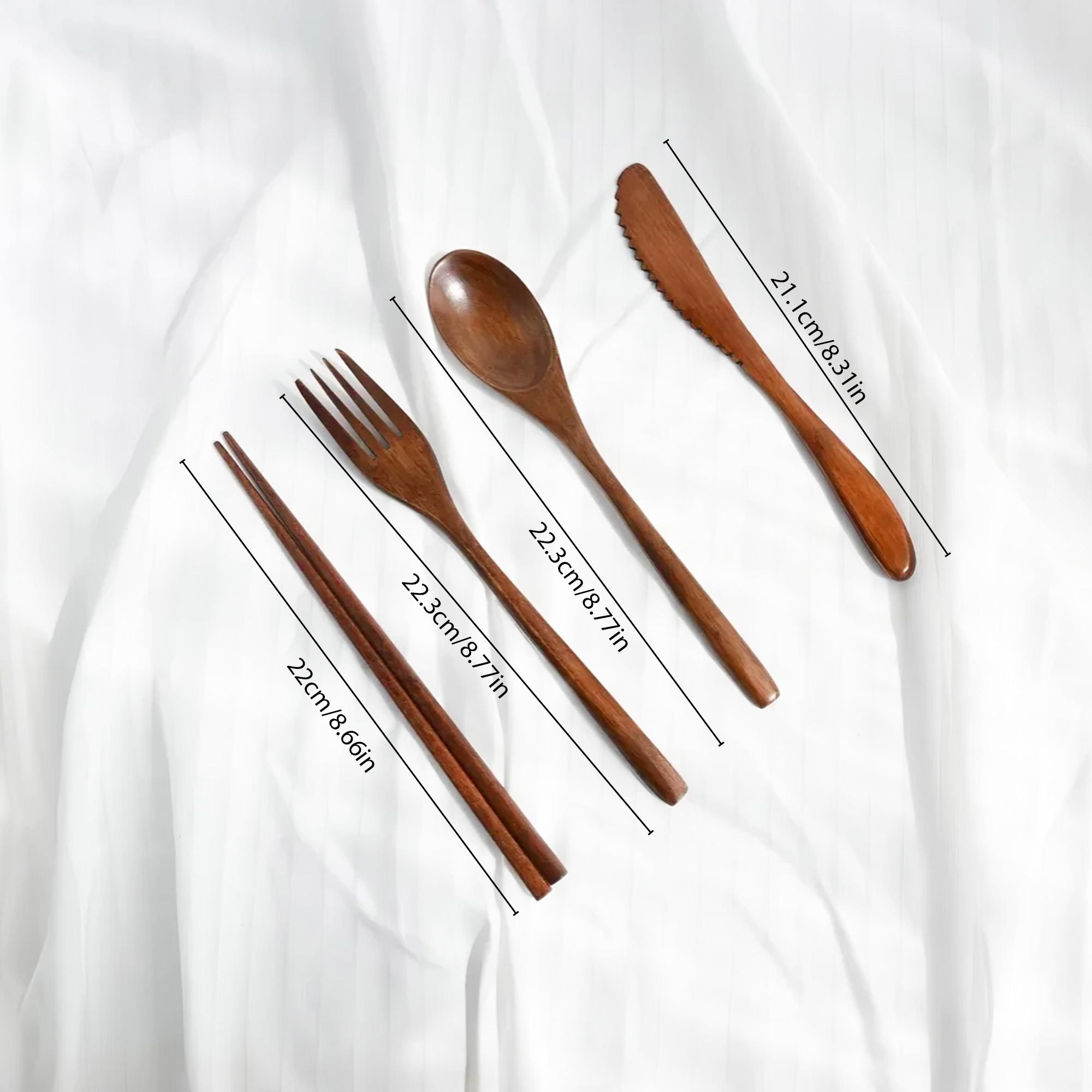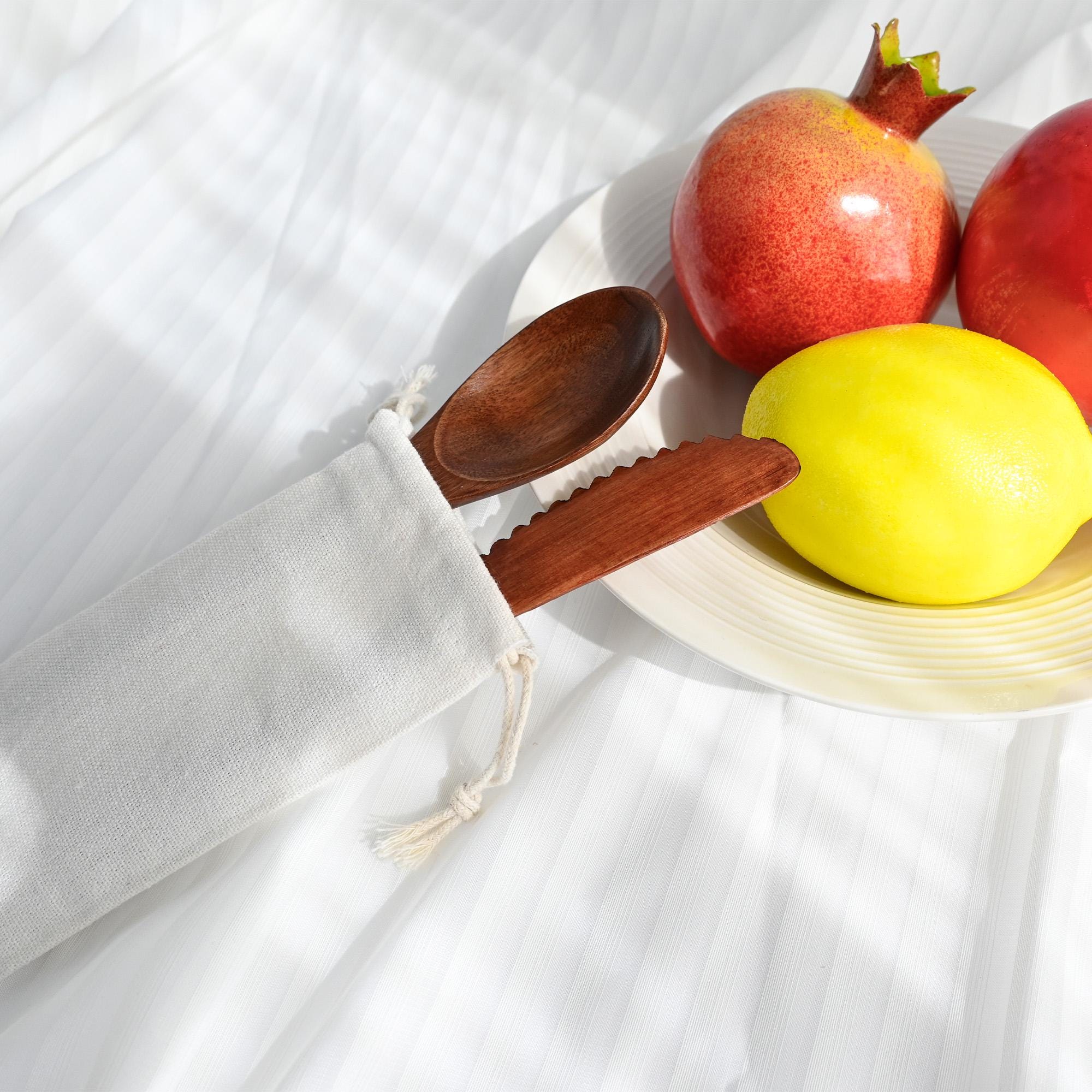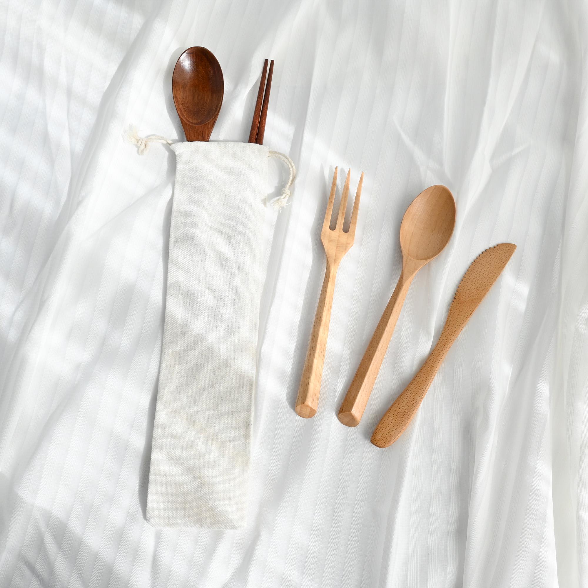 ✨ KEY FEATURES Complete Sustainable Set: Includes one wood fork, one wood spoon, one pair of wood chopsticks and one wood knife. Protective Linen Case: A drawstring pouch made from natural linen keeps your utensils clean and organized in your bag, backpack, or glove compartment.
