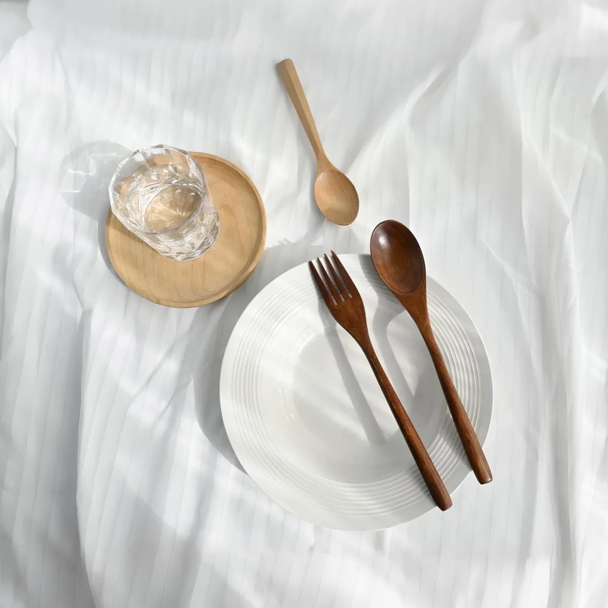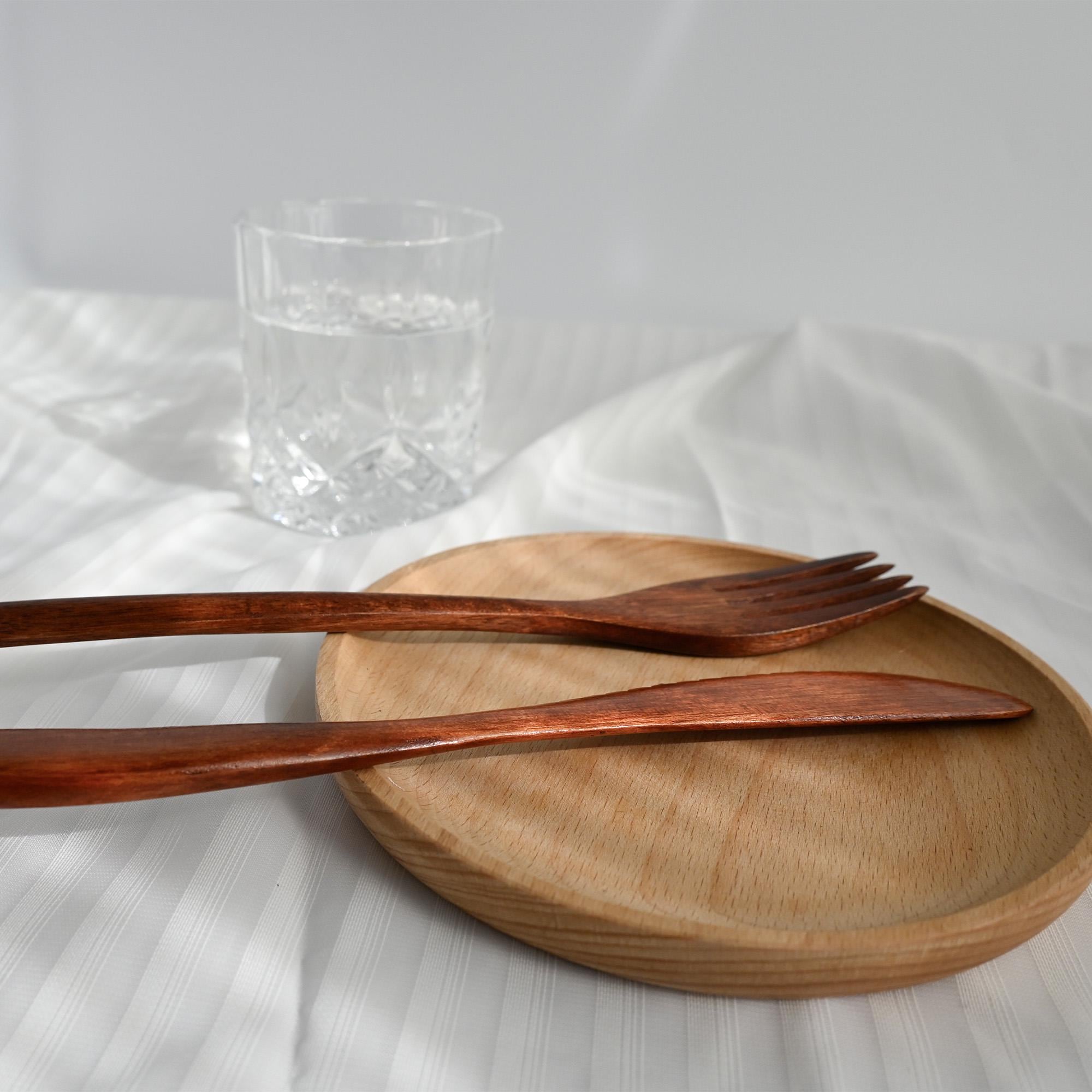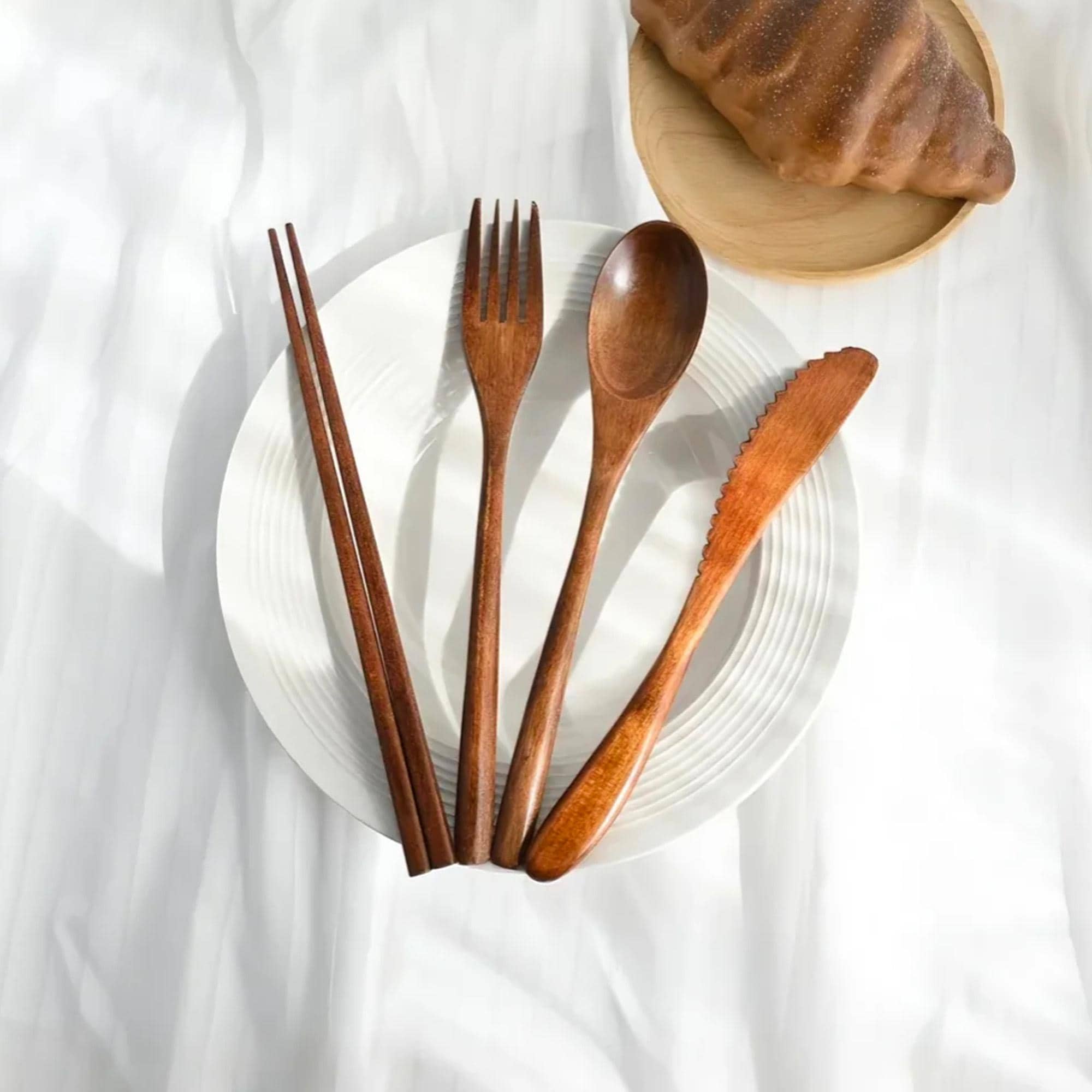 Ergonomic & Practical: Designed for comfort and everyday use. The spoon is ideal for soups and cereals, the fork for salads, and the chopsticks for noodles and knife is ideal for cutting more. Zero-Waste Essential: Proudly reduce your plastic footprint with this reusable alternative to disposable cutlery. Artisan Handmade: Each piece is carefully crafted, meaning slight variations in wood grain add to its unique, rustic character. 📏 SPECIFICATIONS Materials: Natural Wood, Linen Color Options: Natural Wood Tone or Dark Brown Stain Natural Wood Spoon Dimensions: 19cm L x 3.5cm W Natural Wood Fork Dimensions: 19cm L x 2.5cm W Natural Wood Chopsticks: Standard Length 22cm Natural Wood Knife Standard: Dark Brown Wood Spoon Dimensions: 22.5cm L x 4cm W Dark Brown Wood Fork Dimensions: 22.5cm L x 3cm W Dark Brown Wood Chopsticks: Standard Length 22cm Dark Brown Wood Knife Standard: Closure: Drawstring linen bag 🎁 IDEAL FOR Daily work lunches at the office Camping trips and hiking adventures Picnics in the park or beach days Keeping in your car for takeout food Sustainable living and zero-waste kits A thoughtful and practical gift for women and men ♻️ OUR PROMISE We are committed to sustainability at every step. Our cutlery is made from responsibly sourced wood and comes in plastic-free packaging. 📦 WHAT YOU GET One complete wooden cutlery set (Fork + Spoon + Chopsticks + Knife) nestled inside one handmade linen carry case.