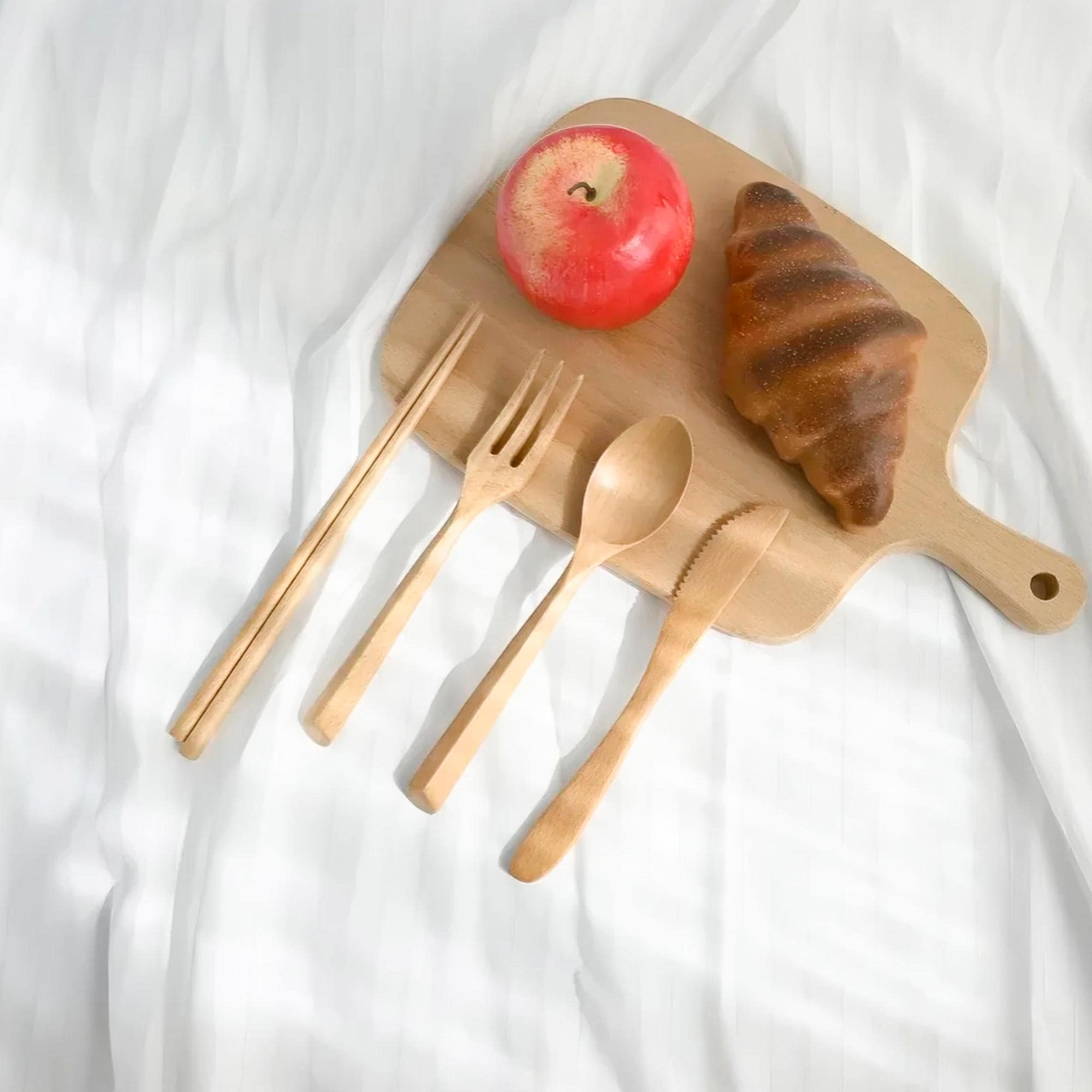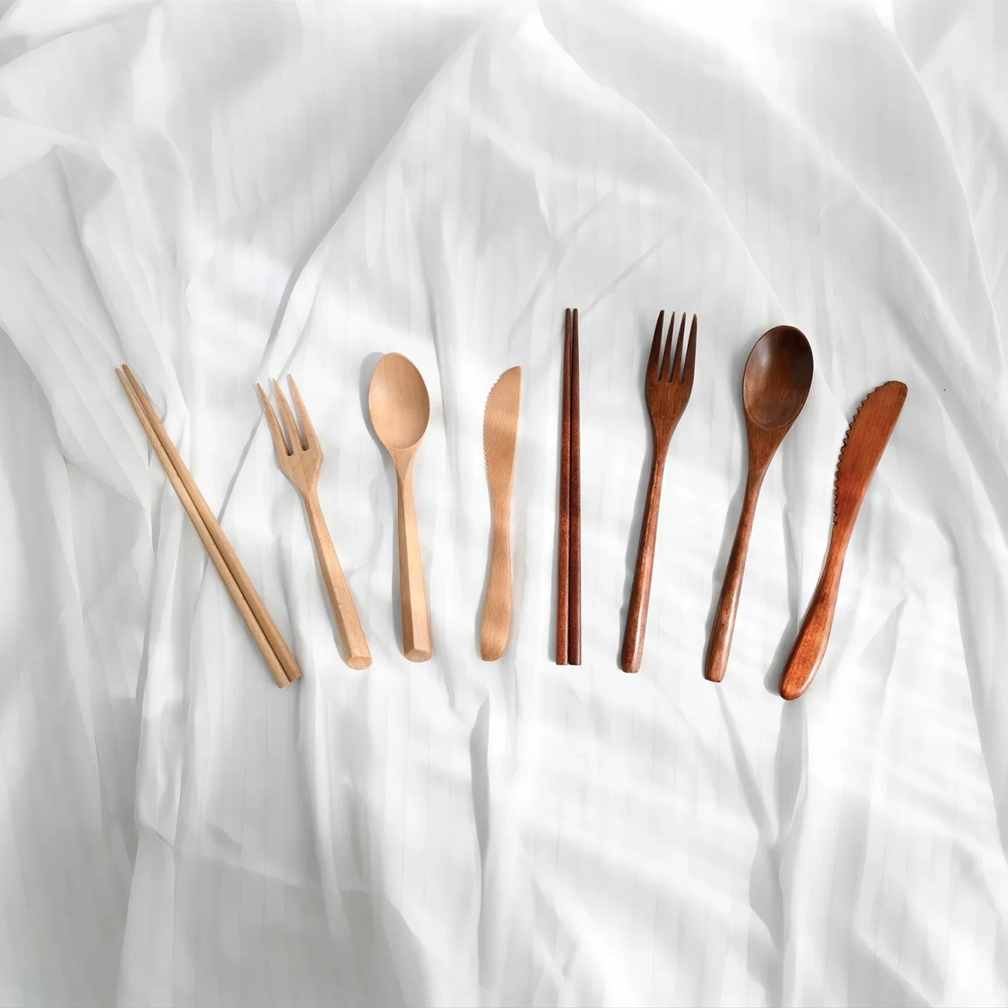 Handmade Wooden Cutlery Set - Reusable Travel Utensils with Linen Case