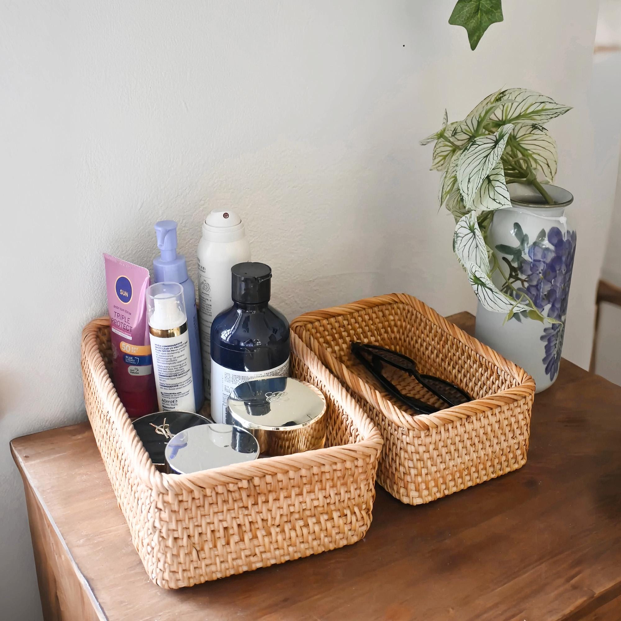 KEY FEATURES All-Natural & Eco-Friendly: Sustainably woven rattan – gentle on the planet, sturdy for everyday use. Multi-Space Hero: Stylish storage for bathrooms (towels/toiletries), kitchens (fruits/utensils), living rooms (blankets/remotes), bedrooms (cosmetics/clothes), and gardens (tools/harvest). Thoughtful Gift Ready: Surprise moms, gardeners, or eco-conscious friends with a practical, charming present! 3 Perfect Sizes: Choose your ideal fit (exact dimensions below). SIZE GUIDE (Handmeasured for Accuracy!) Small: 20cm (L) × 14cm (W) × 7cm (H) Medium: 25cm (L) × 17cm (W) × 8cm (H) Large: 30cm (L) × 20cm (W) × 9cm (H) Note: Slight 1-2cm variations may occur due to handmade artistry. Each rattan basket is uniquely textured – minor natural marks add rustic character! GIFTING MADE SPECIAL Ideal for: Easter Basket Gifts (fill with treats!) Mother’s Day (pair with spa goodies) Housewarming (add plants or artisan soaps) Anniversaries & Weddings (charming decor or card holder) CARE INSTRUCTIONS Keep away from direct sunlight/heat. Avoid grease or liquids. Gently brush dust; wipe with a barely damp cloth. Color may vary slightly due to natural material. SHIPPING Ships from China via reliable carriers. OUR PROMISE Love it or let us know! Contact Betoomhandmade within 24 hours for support.