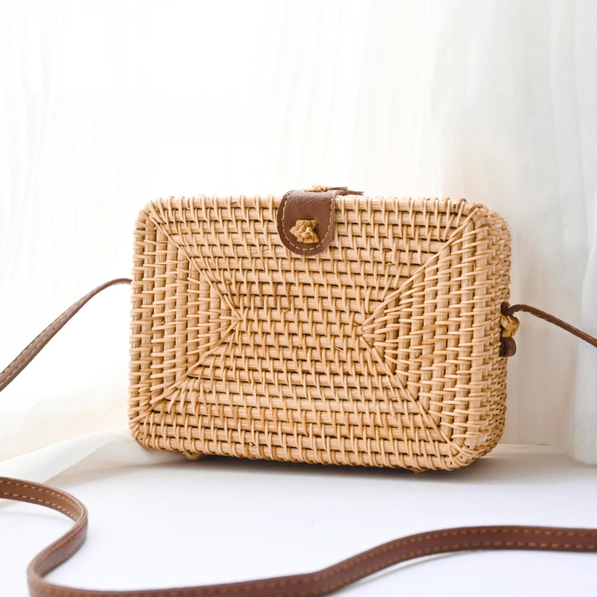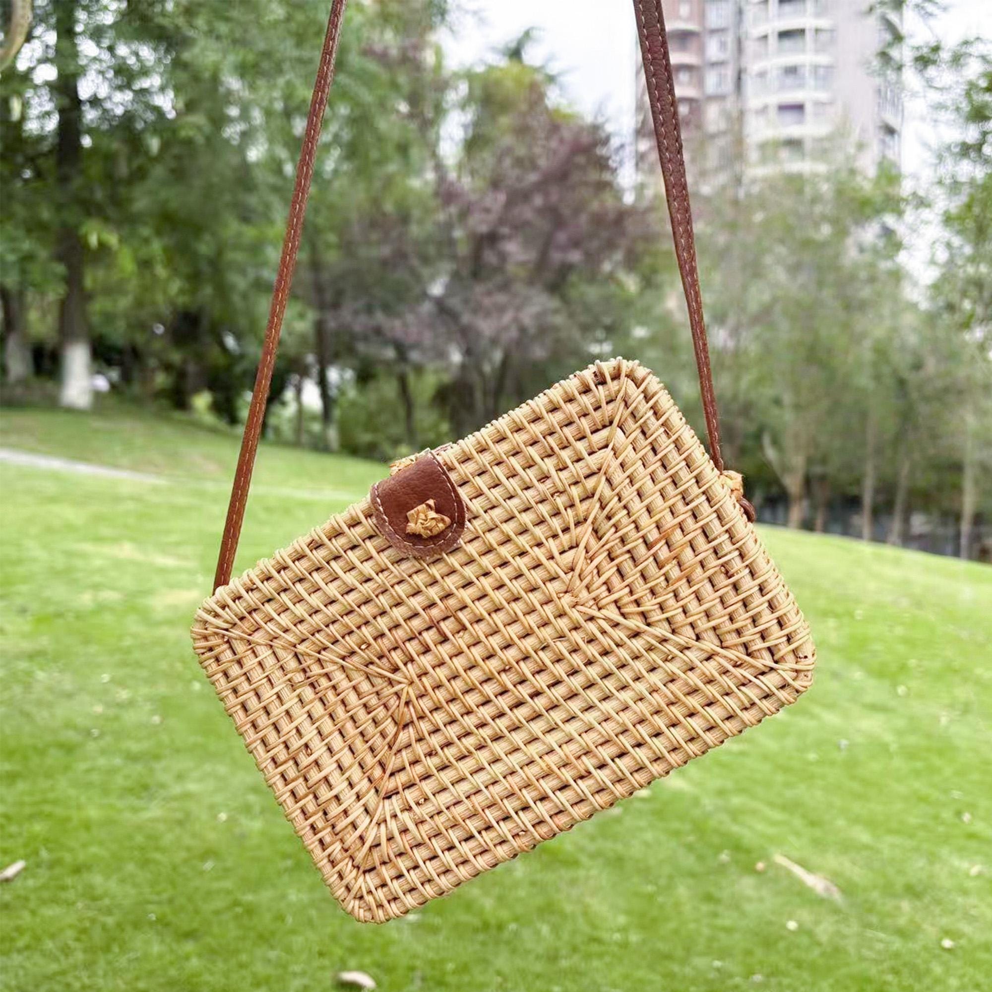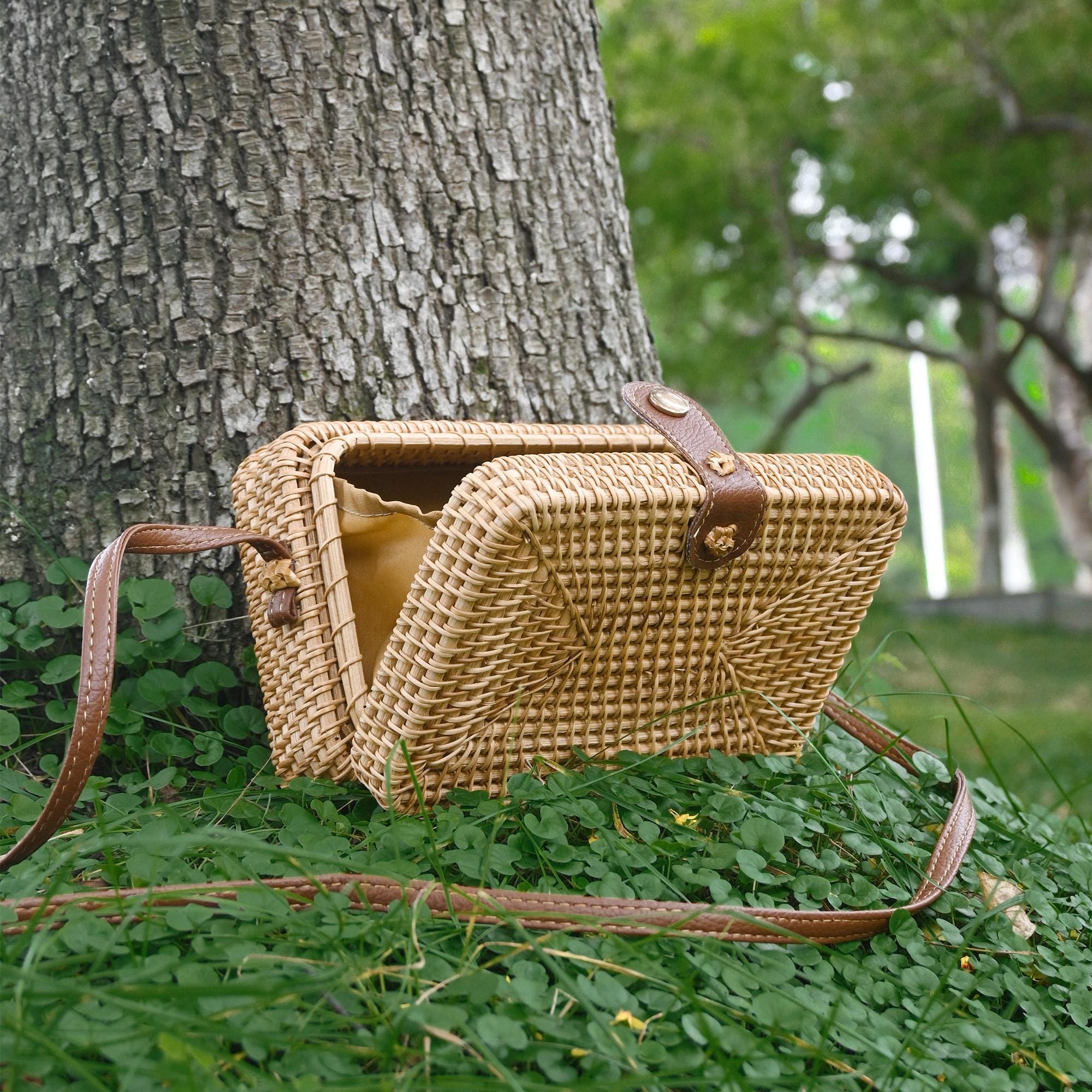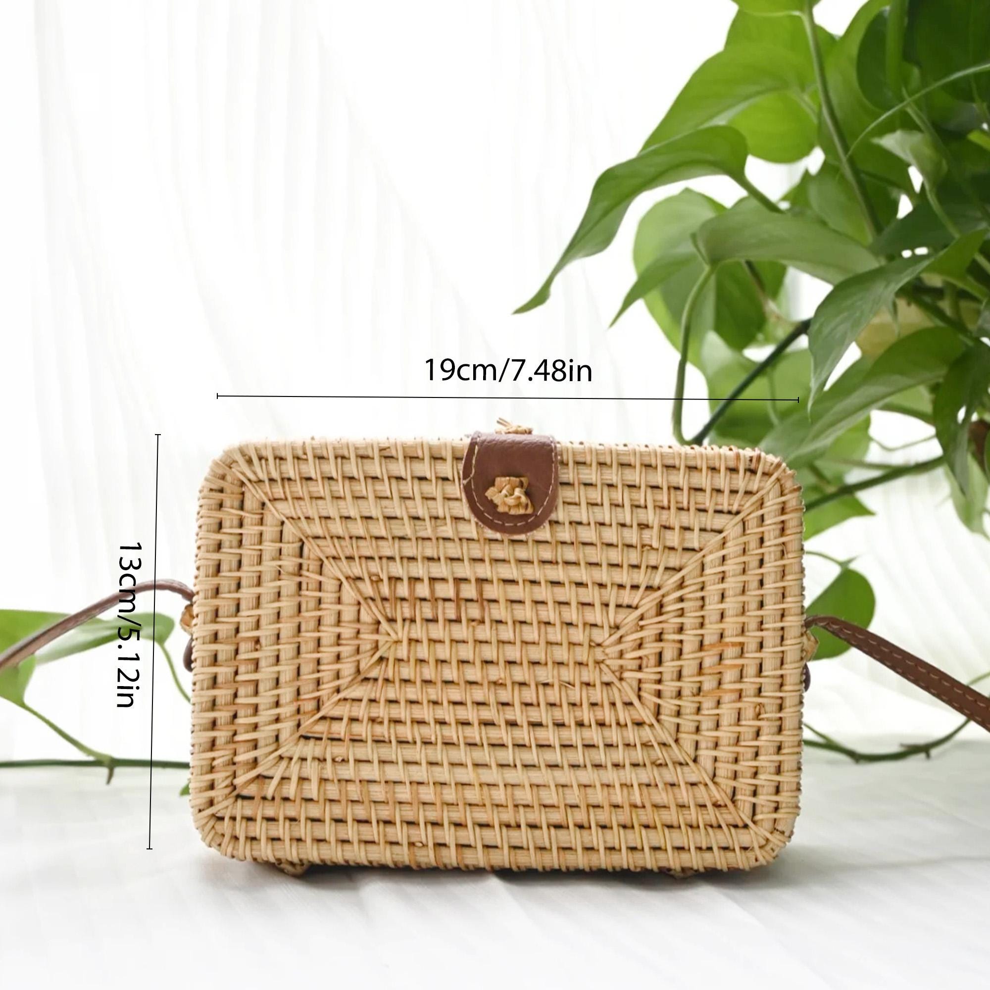 Structured Rectangular Wicker Crossbody Bag – Modern Boho Functionality Meet the structured sibling to the handbag: our Rectangular Wicker Bag. This design offers a modern boho purse look with defined lines and a spacious interior, making it both stylish and practical. Expertly handwoven from natural rattan, this sling bag features a sleek rectangular shape that easily holds your daily essentials while adding a touch of architectural interest to your outfit. PRACTICAL ELEGANCE Structured Design: The rectangular shape provides a modern twist on the classic handmade bag and offers easy organization. Spacious Interior: Deceptively roomy, designed to fit your phone, wallet, keys, and a small cosmetic pouch with ease. Durable Construction: Handwoven with precision for a sturdy, long-lasting frame that holds its shape. Versatile Strap: The adjustable genuine leather strap allows for crossbody or shoulder wear. Artisan Made: Crafted with the same commitment to sustainable materials and traditional techniques. THE PERFECT BAG FOR: Everyday use where a more structured look is preferred Those who appreciate a modern, geometric aesthetic Carrying a few more essentials without sacrificing style Pairing with both casual and more polished outfits PRODUCT DETAILS Size: 7.48*5.12*2.76in Material: Natural Rattan, Ata Grass, Genuine Leather, Cotton Lining Shape: Rectangular Closure: Snap Button with Leather Loop Strap: Adjustable Leather Strap (Crossbody/Shoulder Length) Interior: Fully Lined shoulder bag Style: Modern Boho, Structured, Geometric
