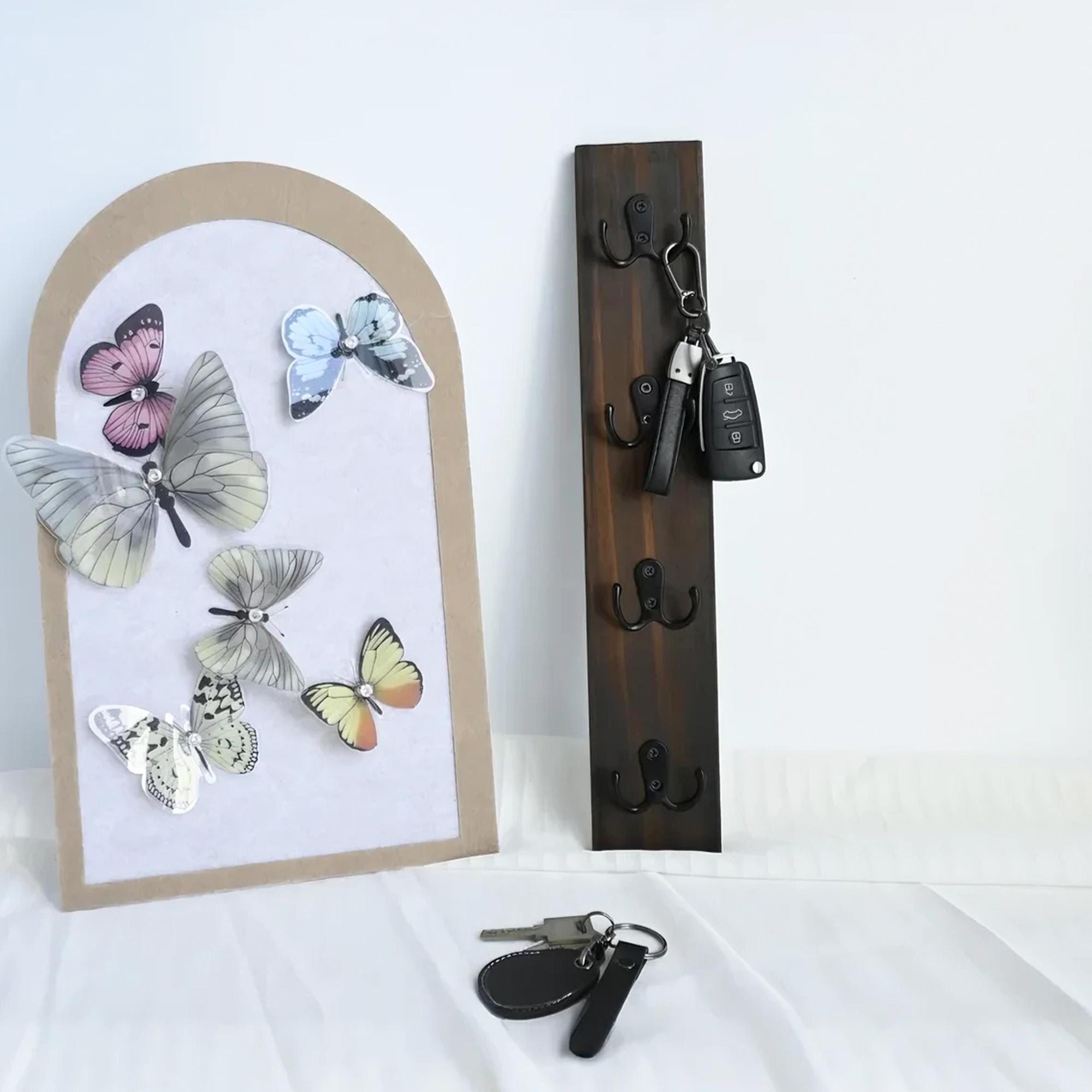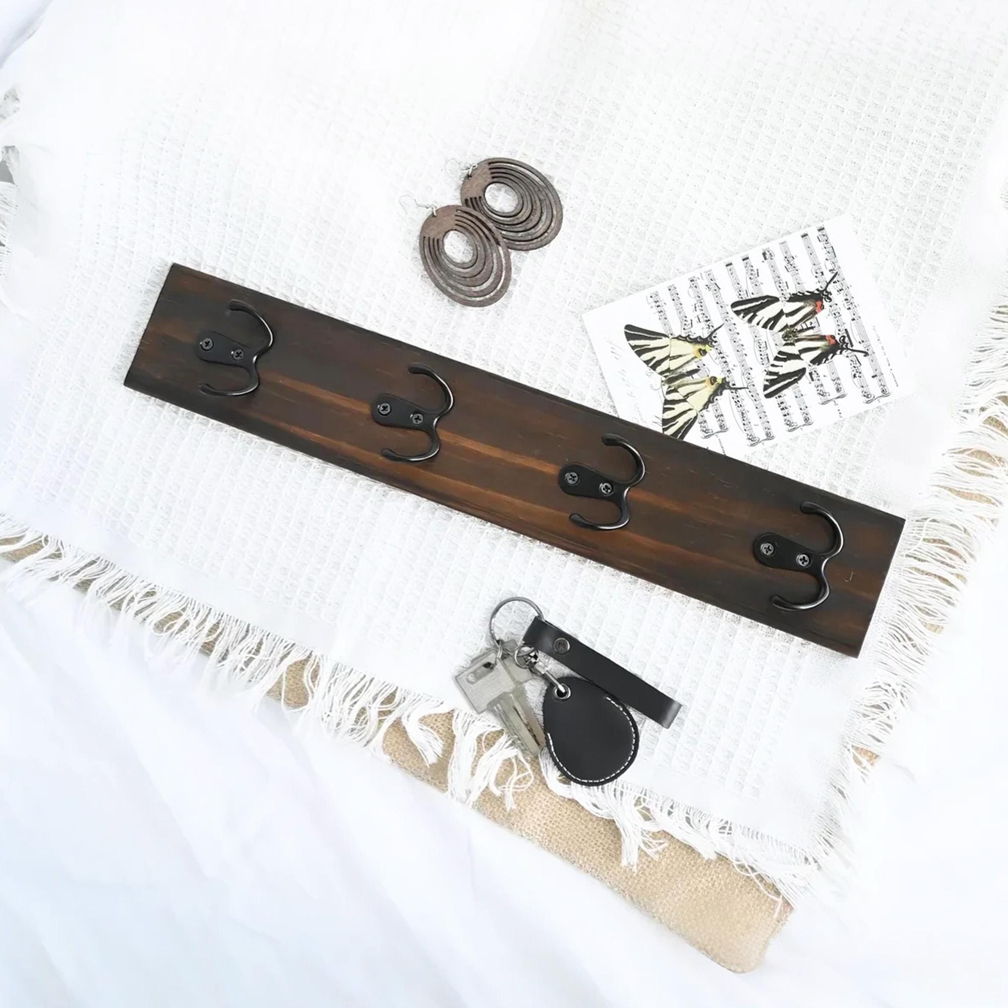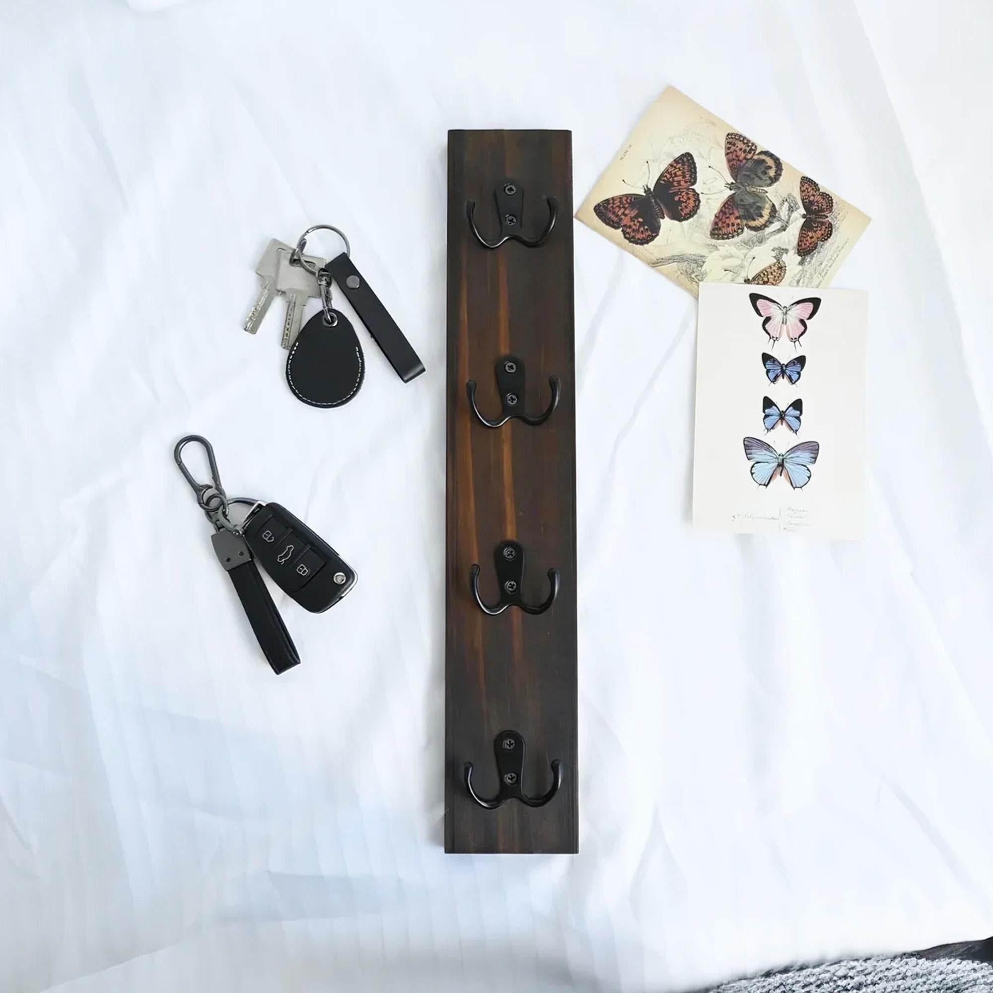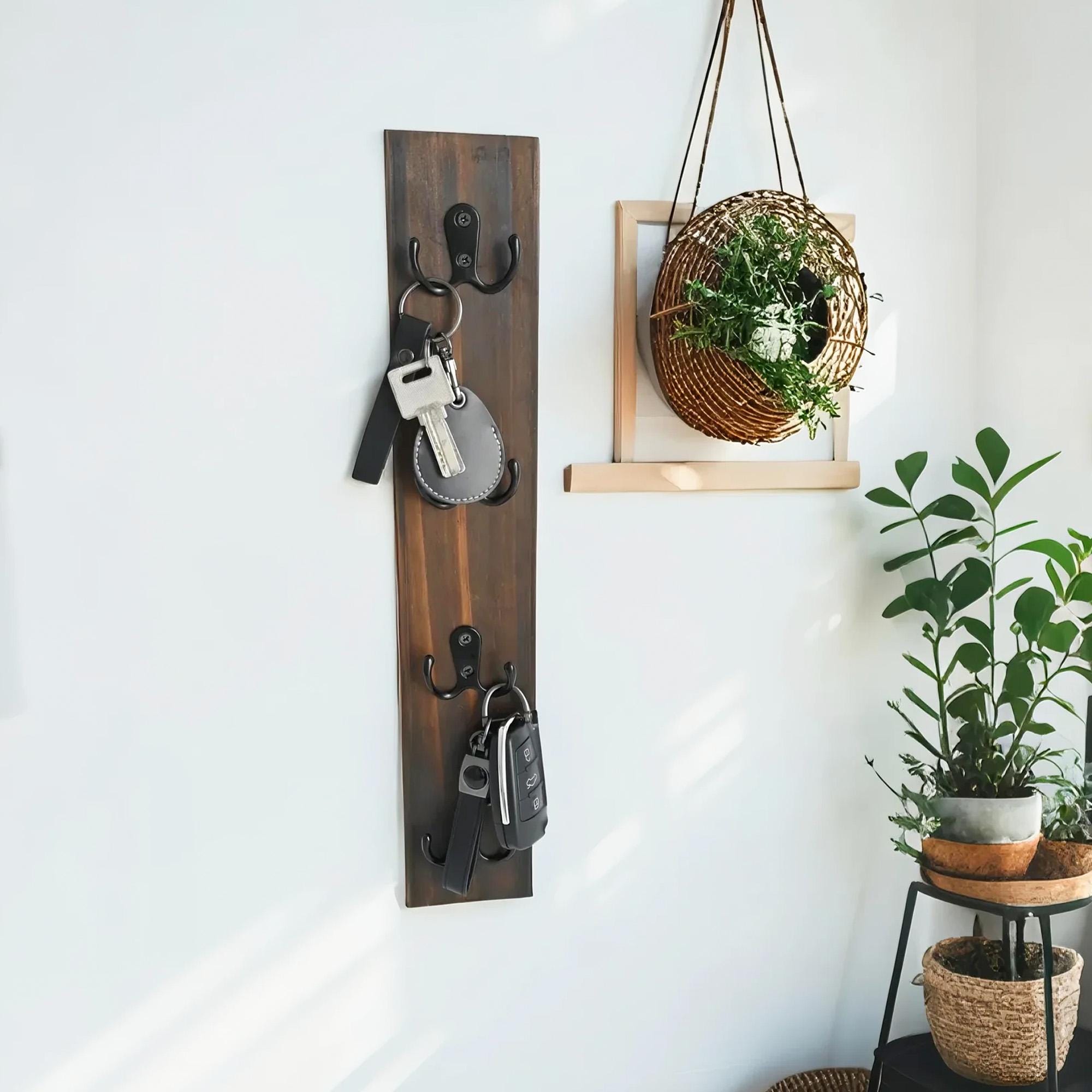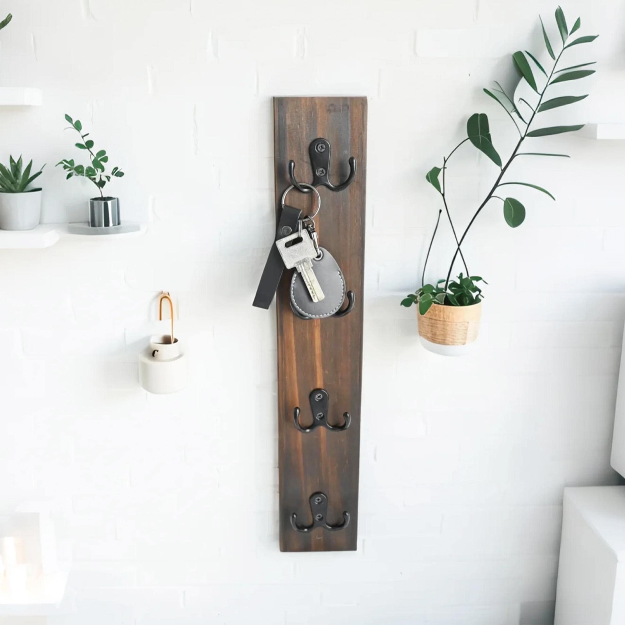 CRAFTED WITH CHARACTER: Material: Solid Wood Color: Beautiful Dark Wood Stain Size: 40 cm (H) x 7 cm (W) x 2 cm (D) | Approx. 15.7" (H) x 2.75" (W) x 0.8" (D) Hardware: Includes [Number - e.g., 5] sturdy black metal hooks and a keyhole mounting system on the back for easy and secure installation. WHY CHOOSE THIS KEY HOLDER? Handmade Quality: Each piece is carefully made by Betoom Handmade, ensuring attention to detail you won't find in mass-produced items. Space-Saving Design: Its tall, vertical profile is ideal for narrow spaces next to the door. Durable & Sturdy: Built from solid wood to hold your daily essentials securely. Warm, Inviting Aesthetic: The dark wood finish adds a touch of warmth and style to any entryway, matching a variety of home decors from farmhouse to modern. 🎁 THE PERFECT HOUSE WARMING GIFT: Practical, beautiful, and thoughtful. This key organizer is a fantastic gift for new homeowners, families, or anyone who appreciates an organized and stylish home.