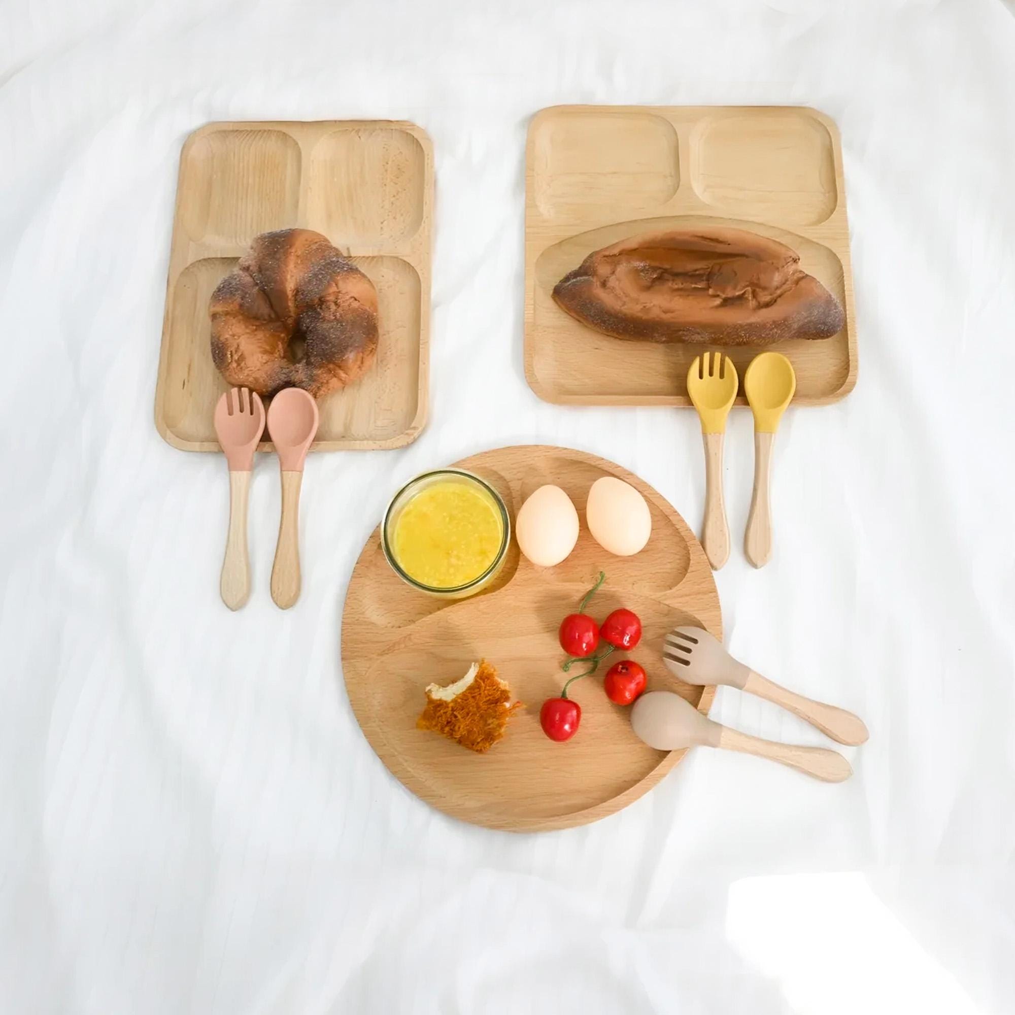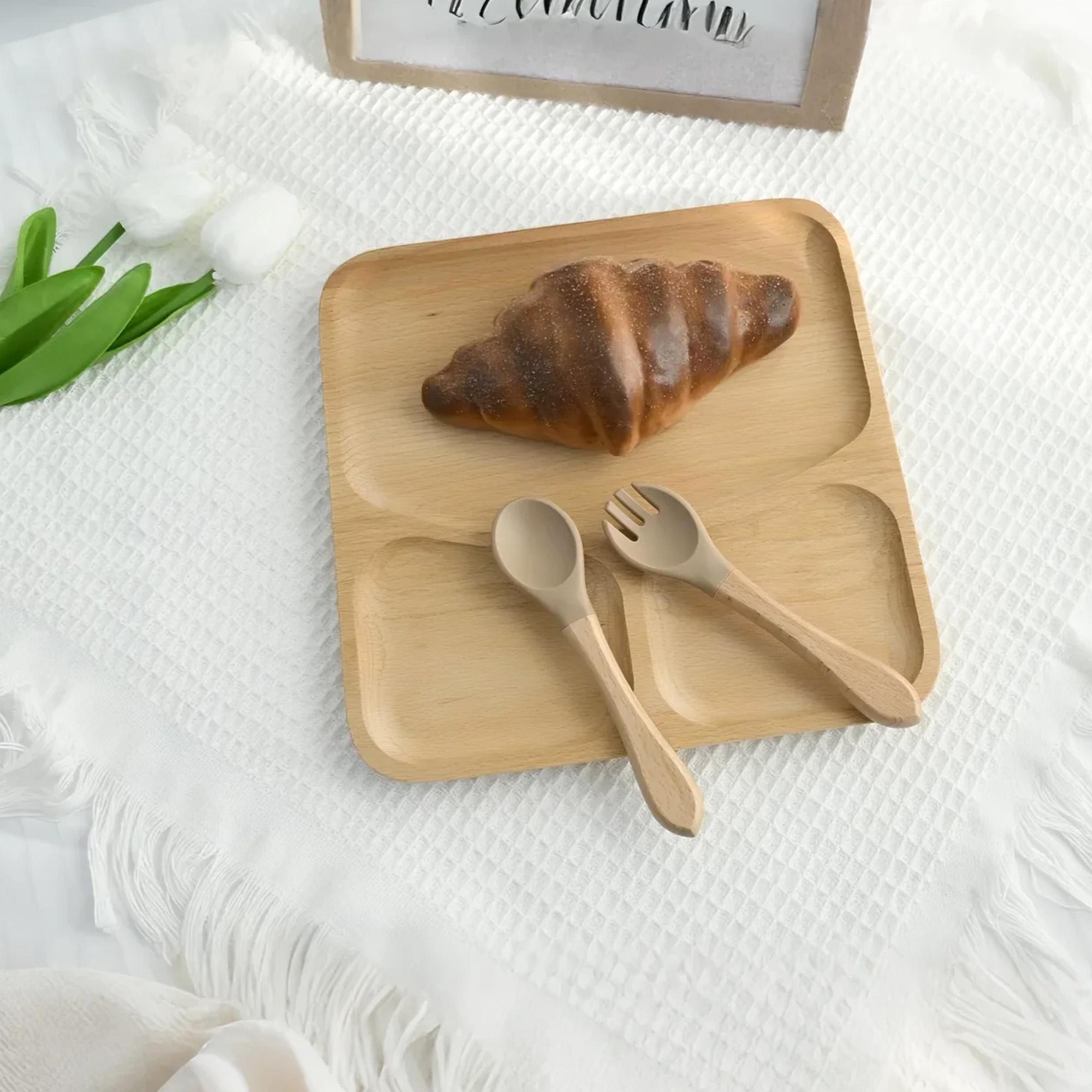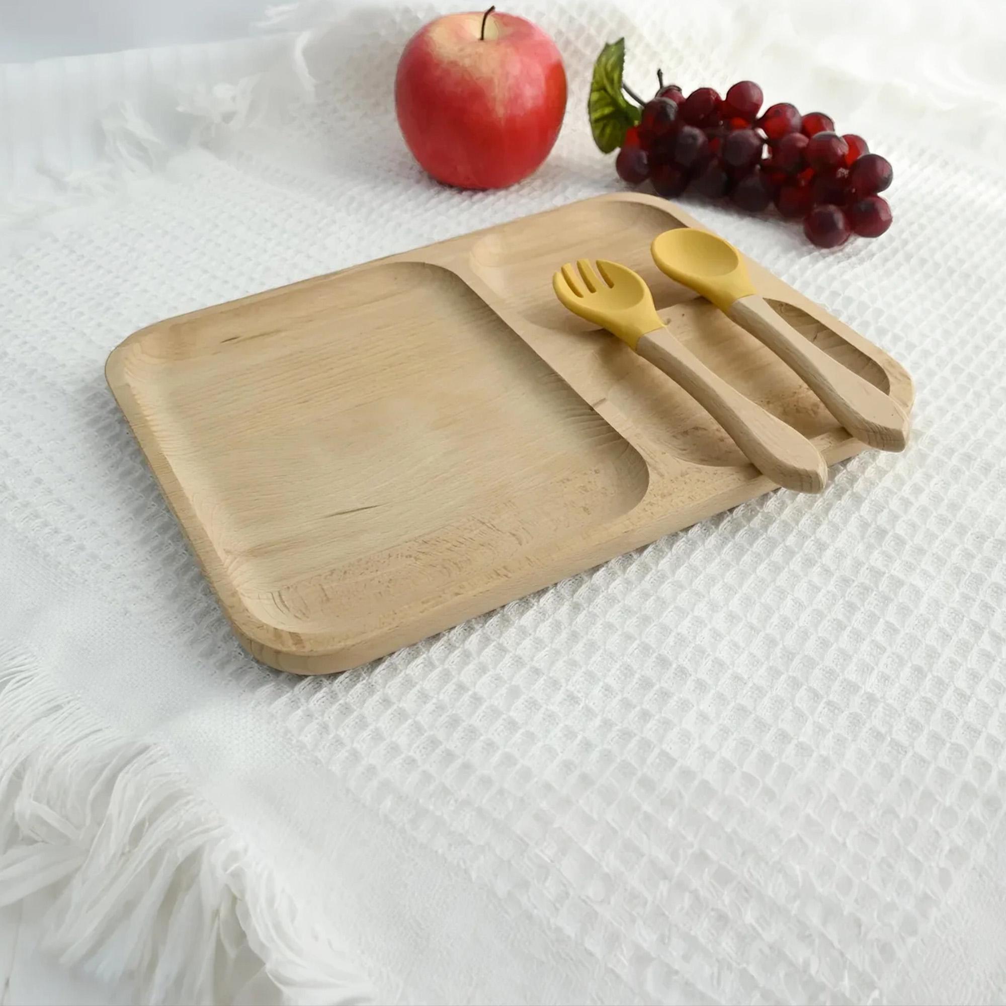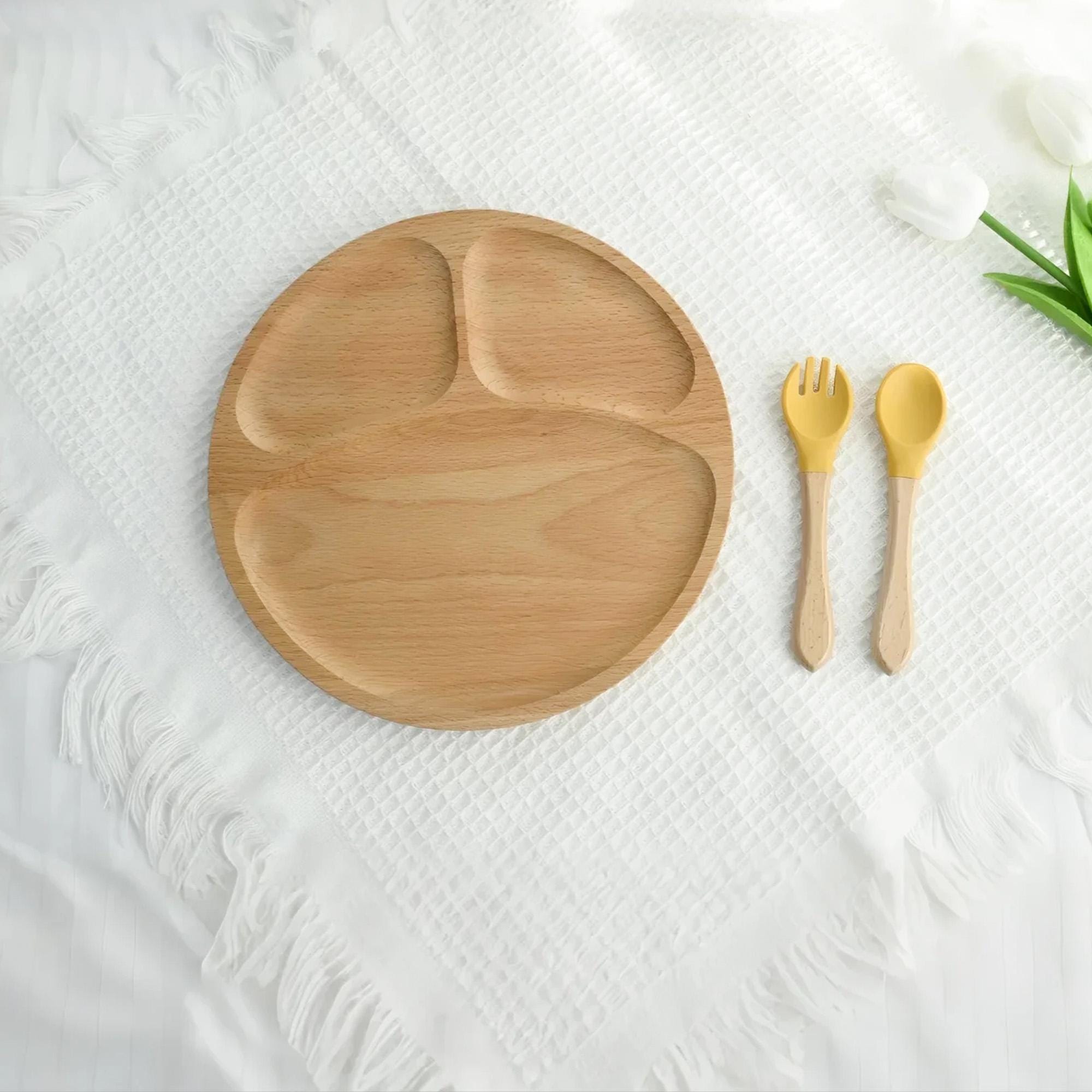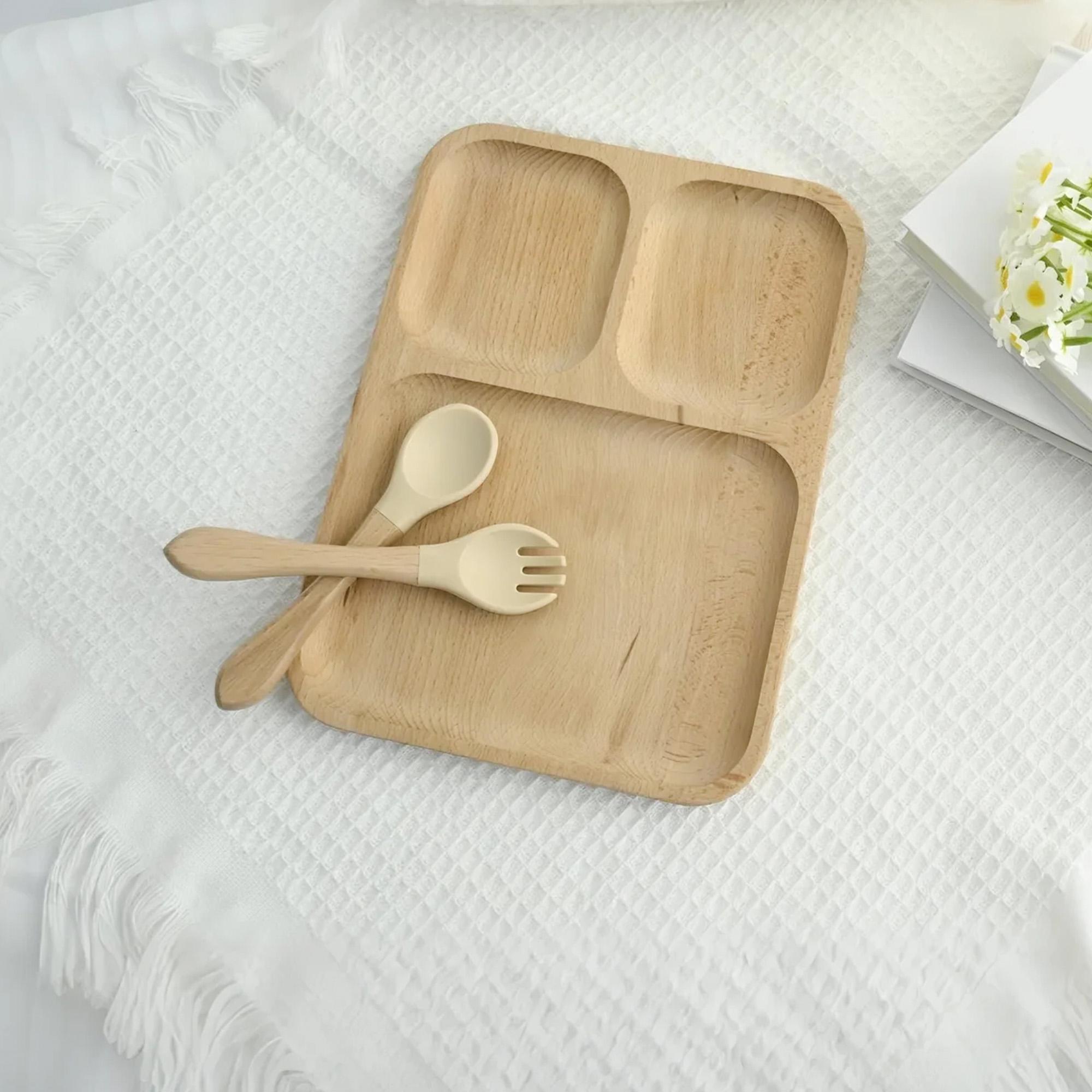 COMPLETE SET: Includes a divided plate PLUS a matching spoon AND fork. The utensils feature a easy-grip wooden handle and a soft, gentle silicone head, perfect for tiny mouths.