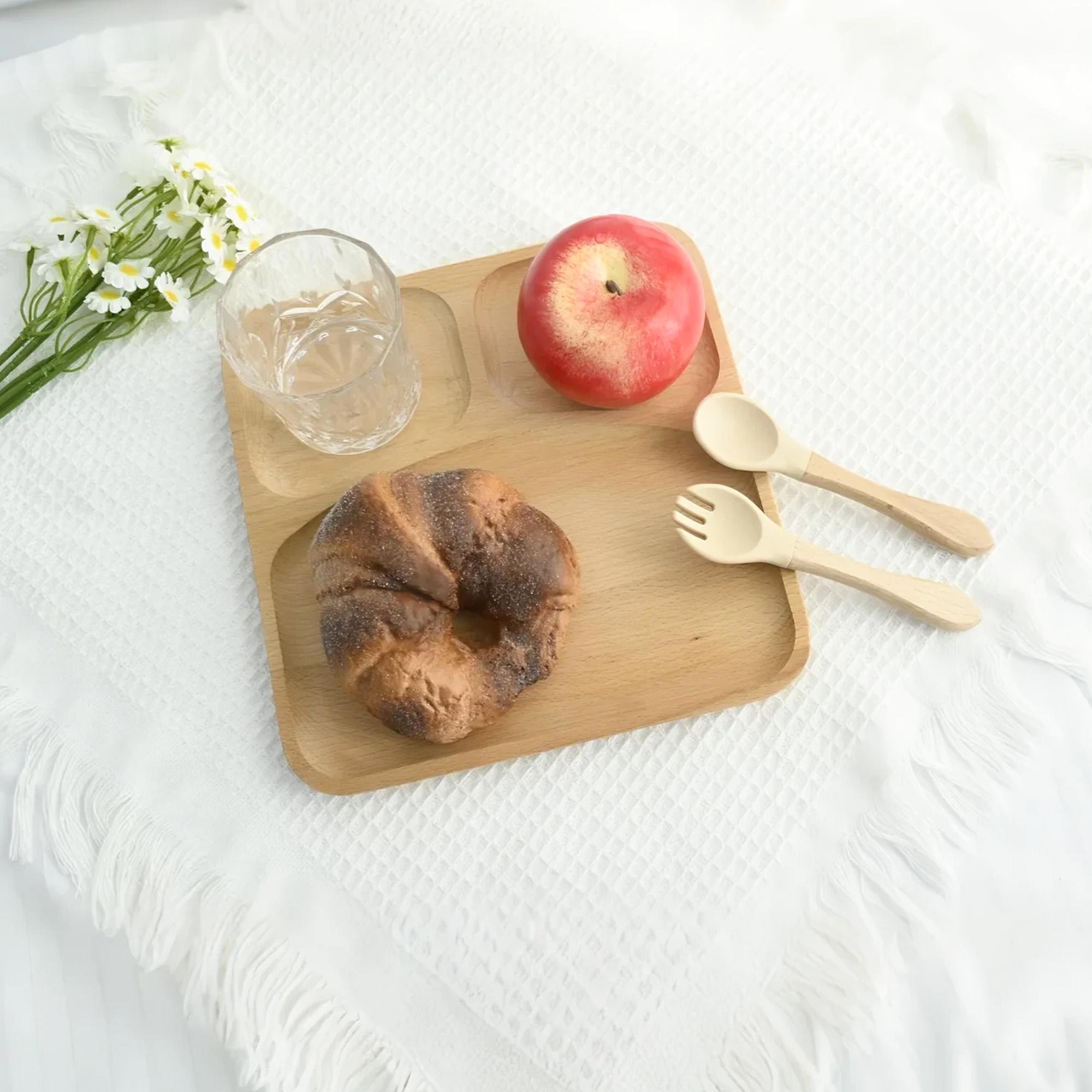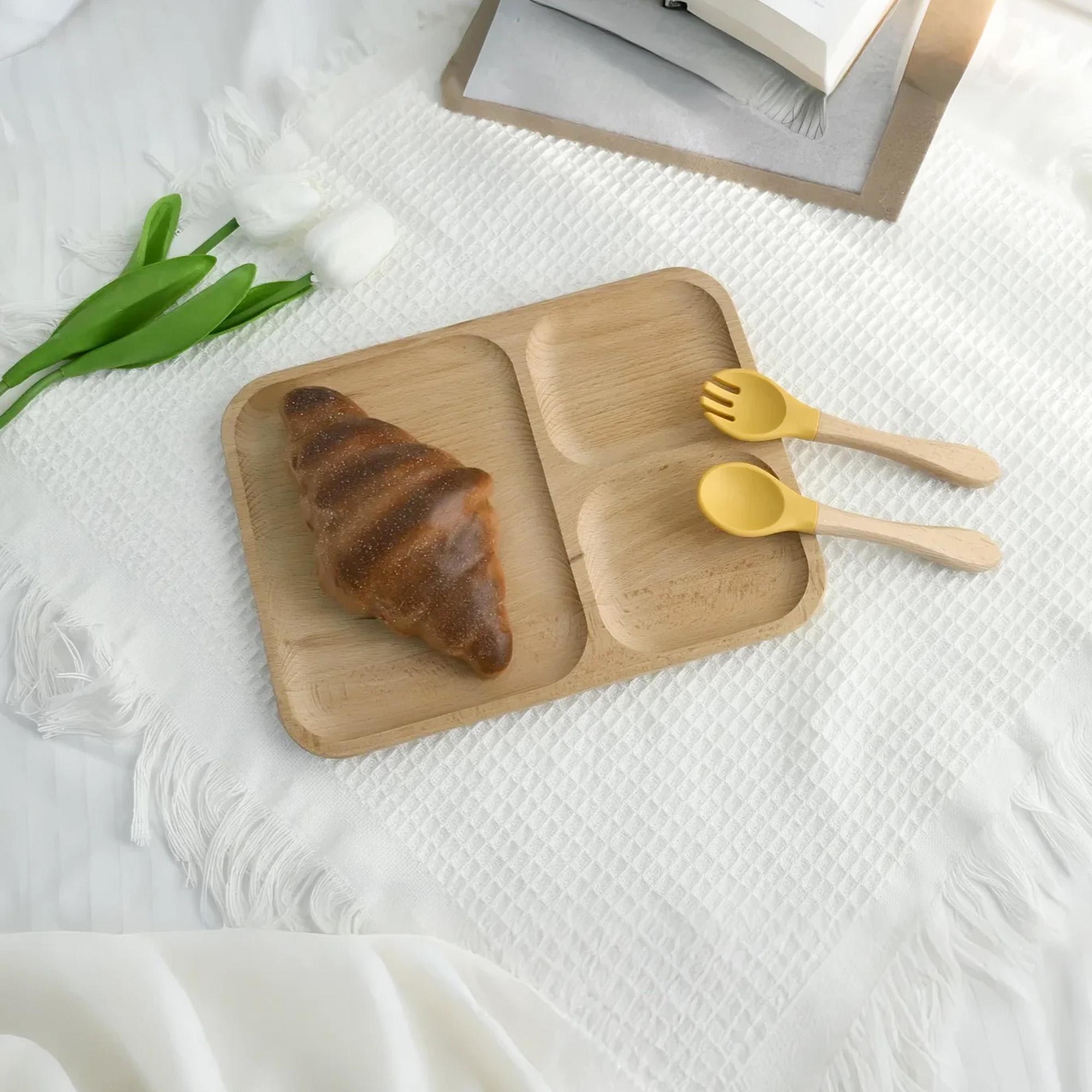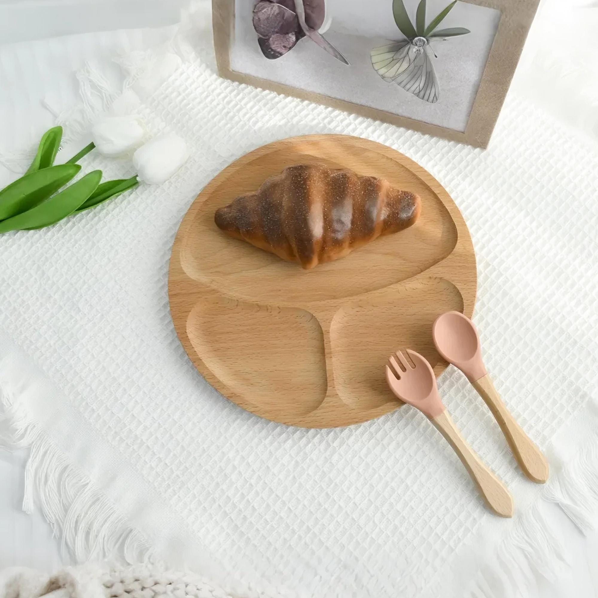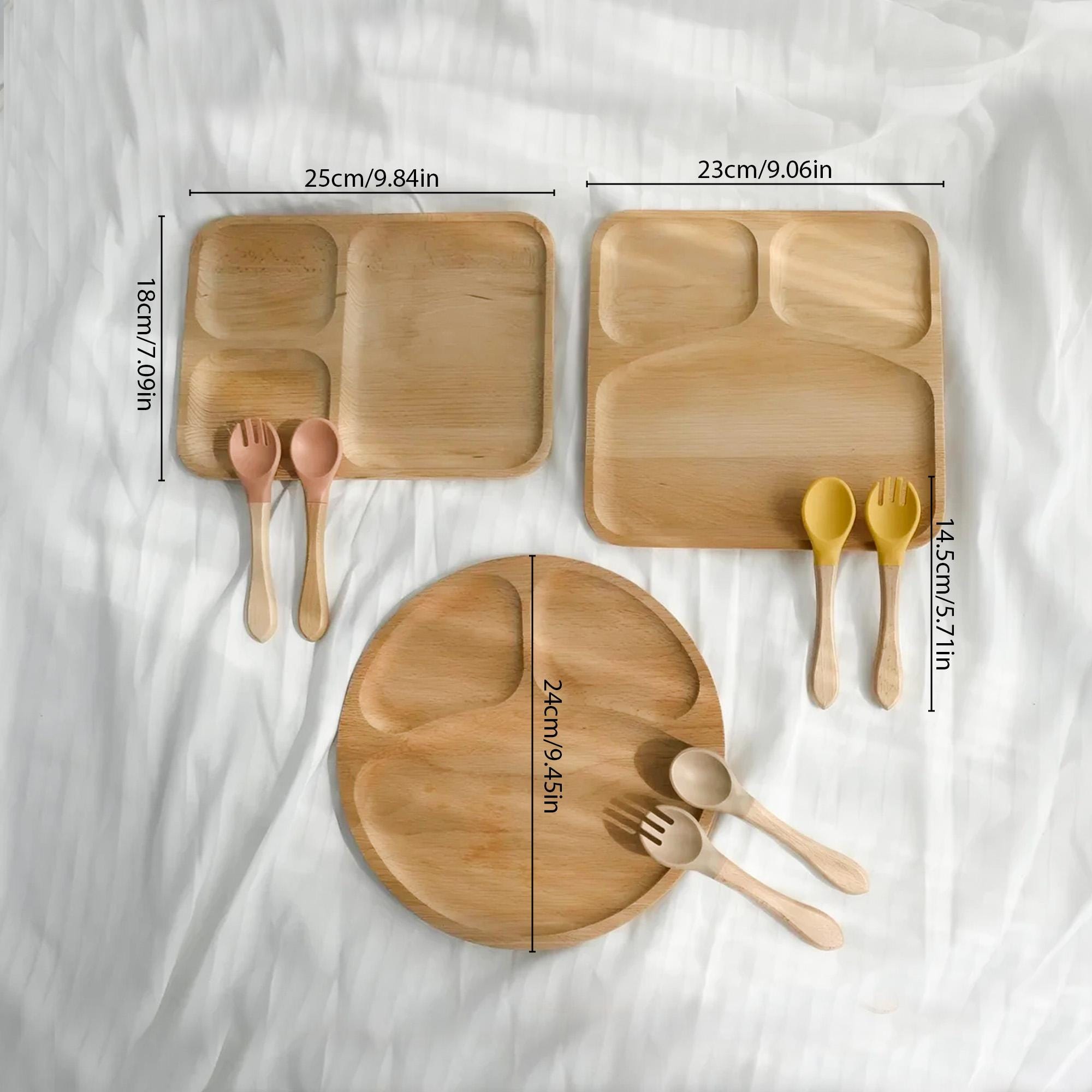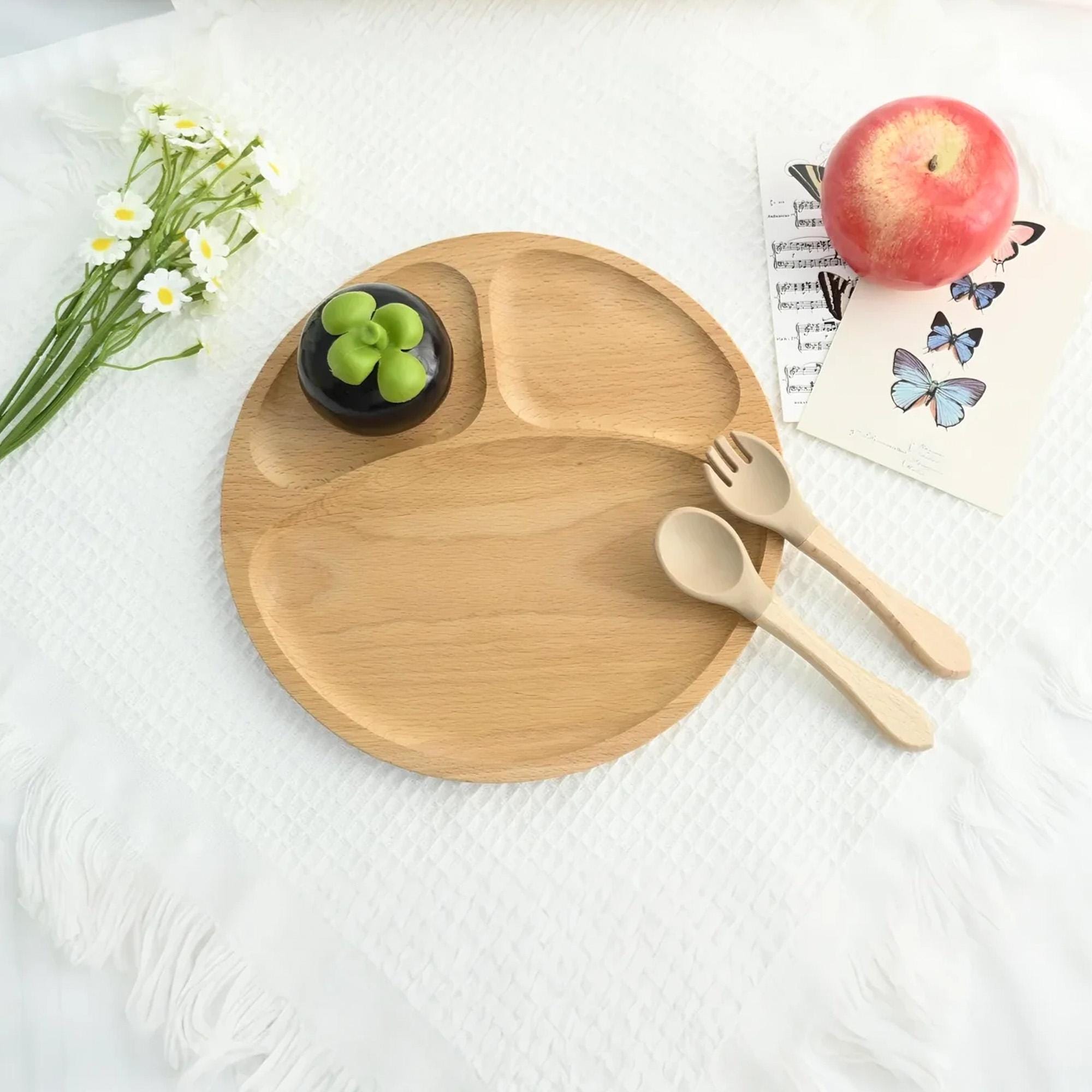 COMPLETE SET: Includes a divided plate PLUS a matching spoon AND fork. The utensils feature a easy-grip wooden handle and a soft, gentle silicone head, perfect for tiny mouths.