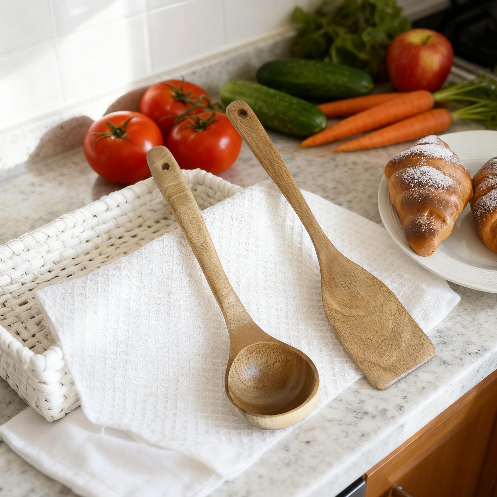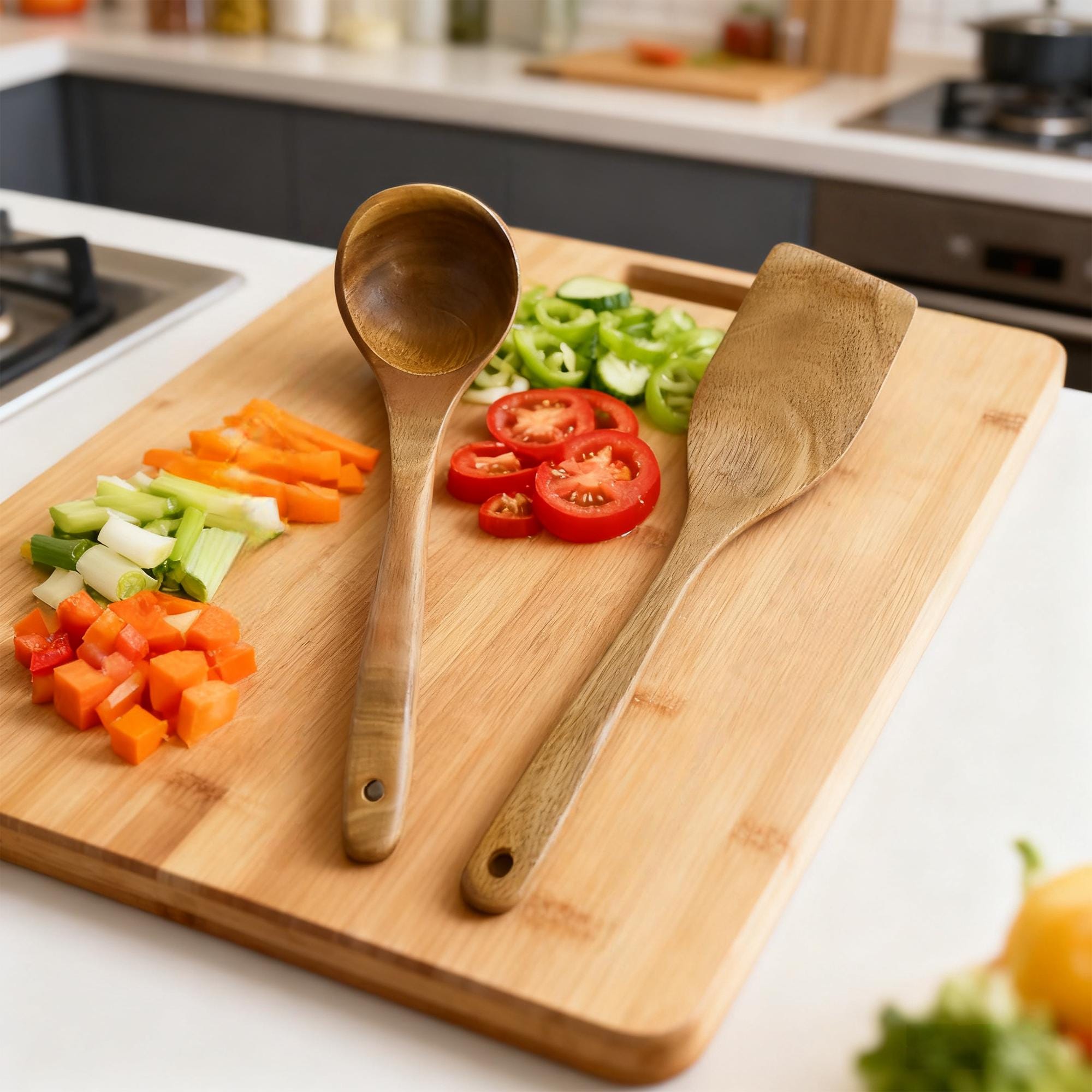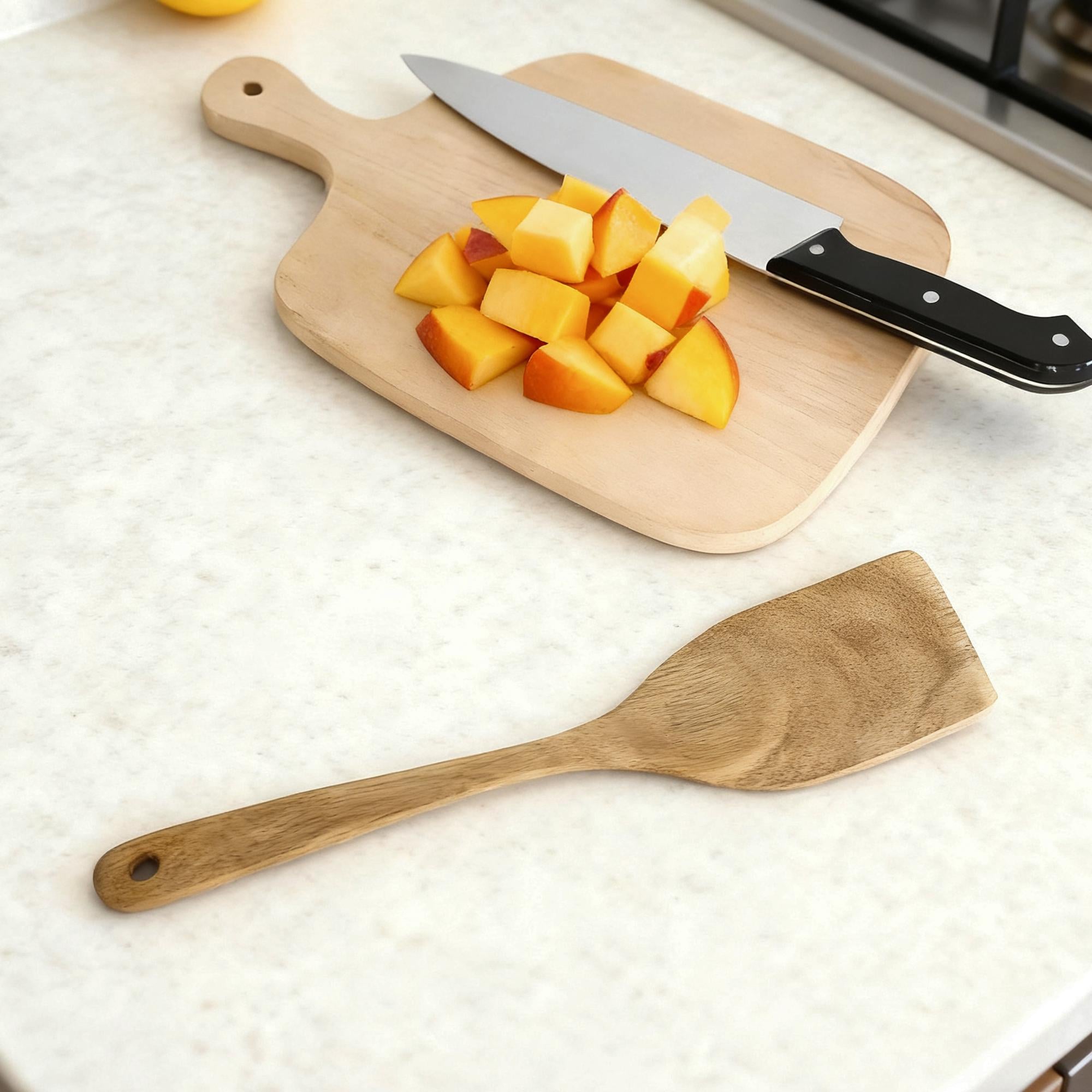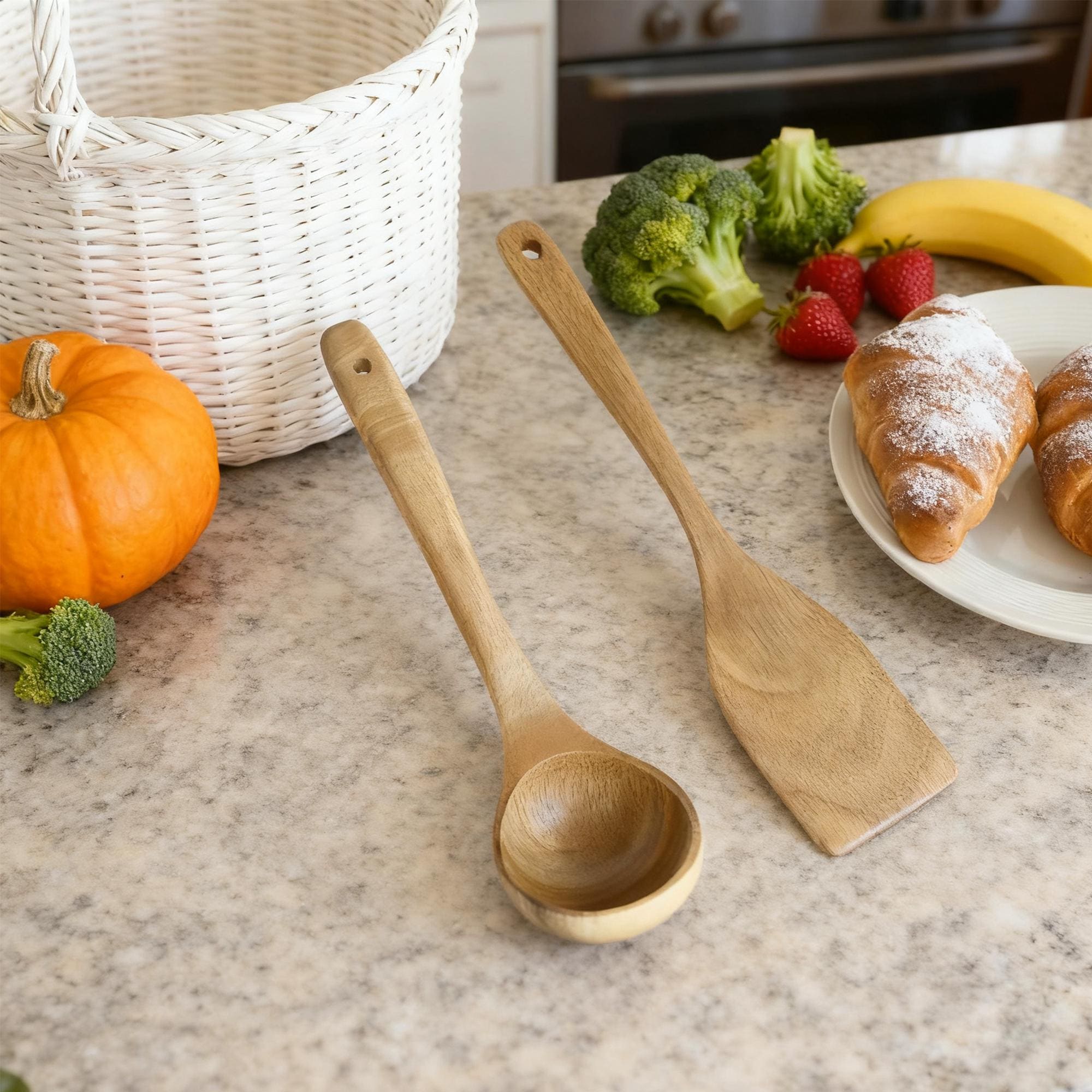 ECO-FRIENDLY & SUSTAINABLE: Crafted from sustainably sourced wood, this set is a beautiful and biodegradable alternative to plastic. Reduce your kitchen's environmental footprint without compromising on style or performance.